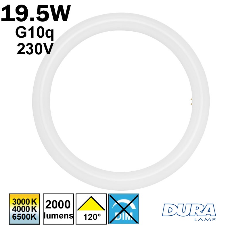 Produit actuellement non disponible. Tube LED circulaire opale 19,5W (2000Lm), culot G10q, tension 220-240V, températures de couleur 3000K, 4000K, 6500K. Ce tube remplace de façon directe les tubes fluorescents G10q Ø400mm sans modifier le câblage du luminaire. DURALAMP CIRCOLINE LCR140W LCR140N LCR140C