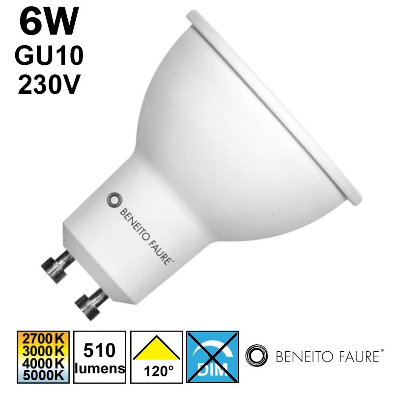 Ampoule LED réflecteur Ø50mm avec un faisceau de lumière très large 120°. BENEITO UNIFORM-LINE 6W, GU10, 230V, températures de couleur 2700K, 3000K ou 4000K. Lampe LED de couleur blanche BENEITO 4015-V2, 4016-V2, 4017-V2