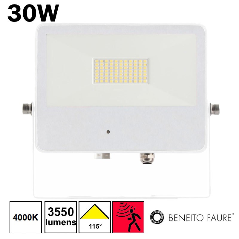 Projecteur LED 30W (3550Lm) de couleur blanc équipé d'un détecteur de présence, qui peut être installé en intérieur ou en extérieur (IP65). Luminaire extra plat (36mm), température de couleur 3000K. Durée de vie 50.000h. BENEITO SKY 4352.