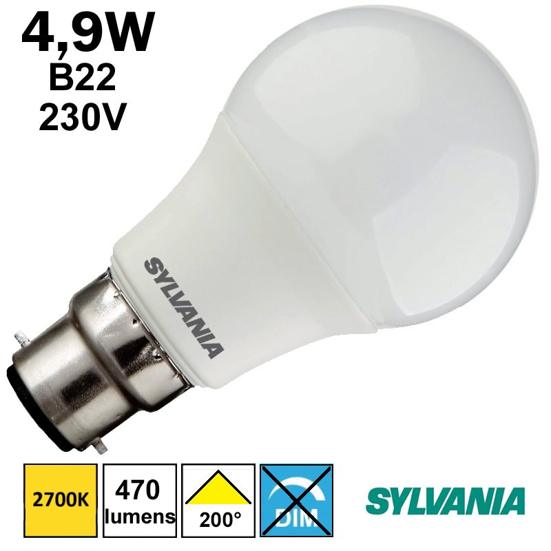 Ampoule Led SYLVANIA ToLEDo Standard GLS 4,9W (=40W filament), culot baïonnette B22, tension 230V, blanc chaud 2700K. Cette ampoule LED est idéale pour l'éclairage général des restaurants, cafés, hôtels et résidentiel. SYLVANIA 0029575
