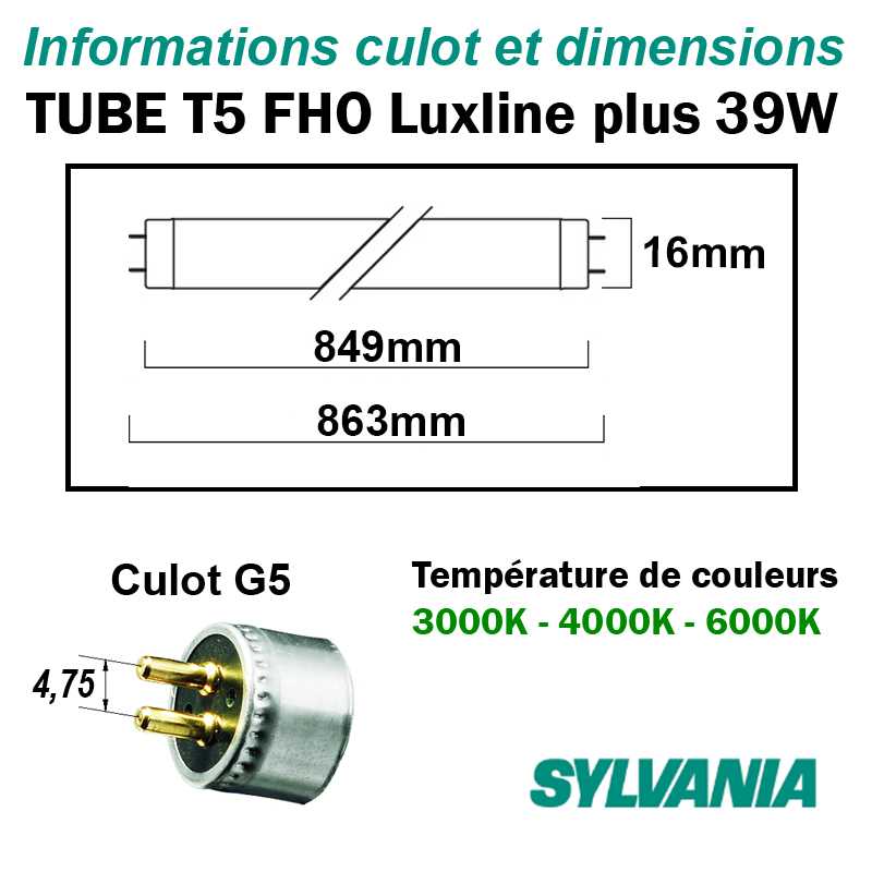Produit plus disponible. Tube fluorescent Sylvania T5 FHO Luxline Plus 39W (Longueur 0.85m / Ø16mm). Températures de couleur disponibles 3000K, 4000K, 6500K - Flux lumineux entre 3250lm et 3500lm.