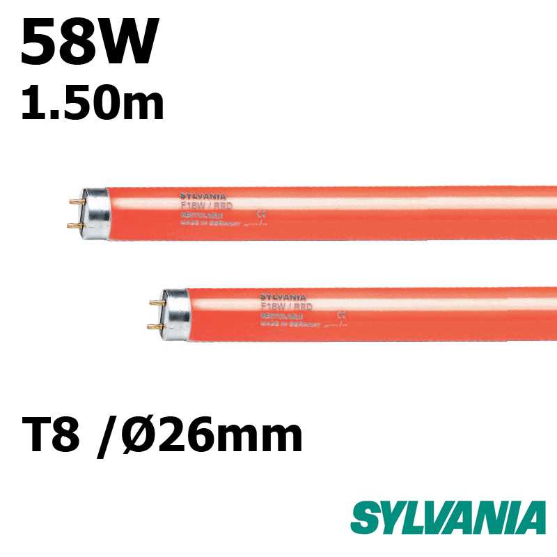 Tube fluorescent ROUGE SYLVANIA T8 (⌀26mm) 58W (longueur 1.5m), culot G13, Utilisation avec un ballast ferro-magnétique ou électronique.