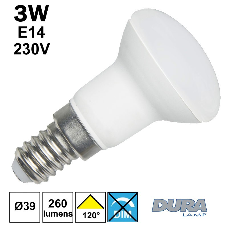 Petit spot LED DURALAMP R39 (Ø39mm), petit culot à vis E14, 230V, faisceau large 120°, température de couleur 3000K. Cette ampoule LED est équivalente à une ancienne ampoule de 25W. DURALAMP L615WB