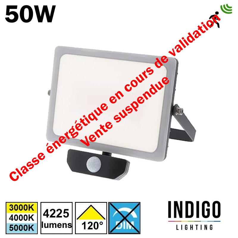 Projecteur LED 50W (5950Lm) de couleur noir équipé d'un détecteur de présence, qui peut être installé en intérieur ...